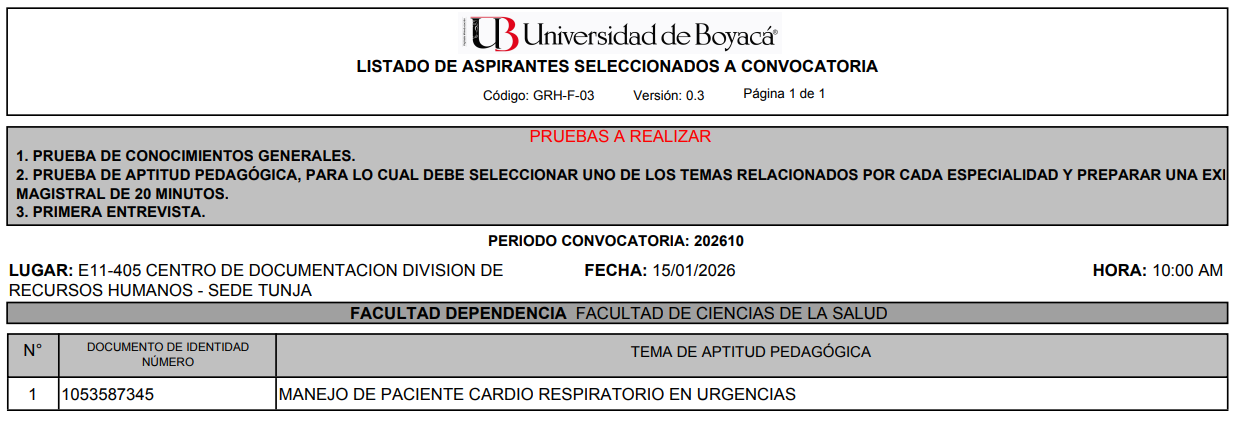 Ingreso de hojas de vida en el aplicativo de la Universidad de Boyacá debidamente soportadas: del miércoles 17 de diciembre a martes 13 de enero de 2026 hasta las 11:59 pm.
