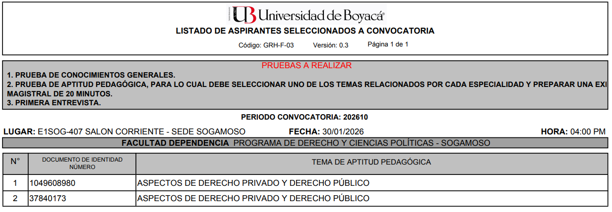 Ingreso de hojas de vida en el aplicativo de la Universidad de Boyacá debidamente soportadas: del martes 27 de enero a miércoles 28 de enero de 2026 hasta las 11:59 pm.