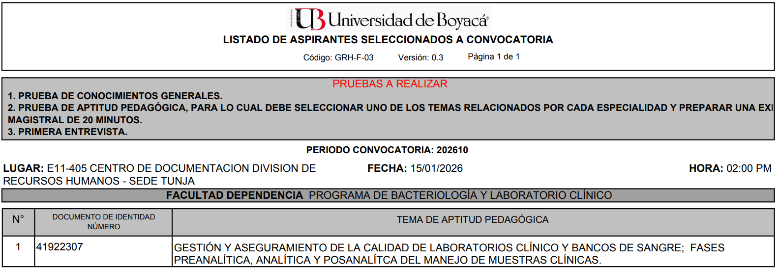Ingreso de hojas de vida en el aplicativo de la Universidad de Boyacá debidamente soportadas: del martes 16 de diciembre de 2025 a martes 13 de enero de 2026 hasta las 11:59 pm.