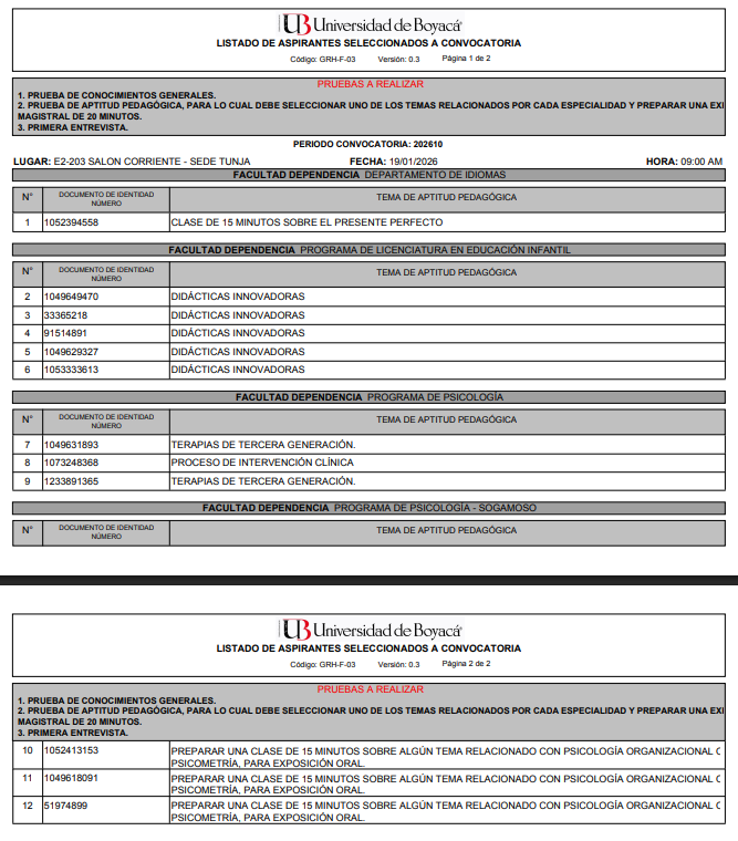 Ingreso de hojas de vida en el aplicativo de la Universidad de Boyacá debidamente soportadas: del sábado 20 de diciembre a jueves 15 de enero de 2026 hasta las 11:59 pm.