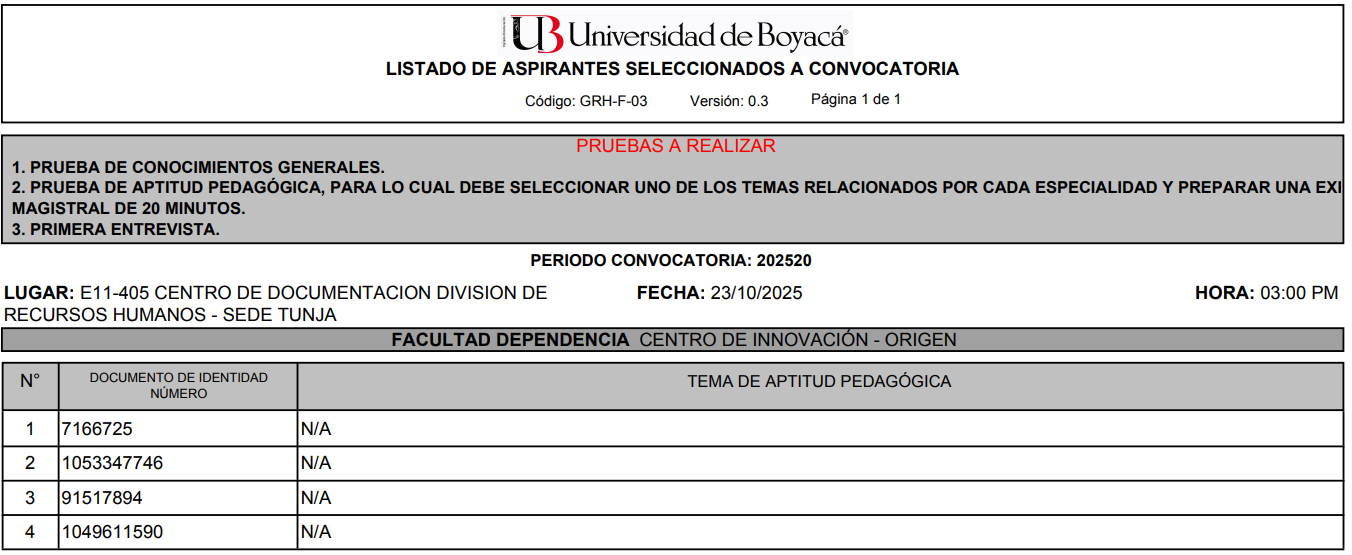 Ingreso de hojas de vida en el aplicativo de la Universidad de Boyacá debidamente soportadas: del lunes 29 de septiembre a viernes 10 de octubre de 2025 hasta las 6:00 pm.