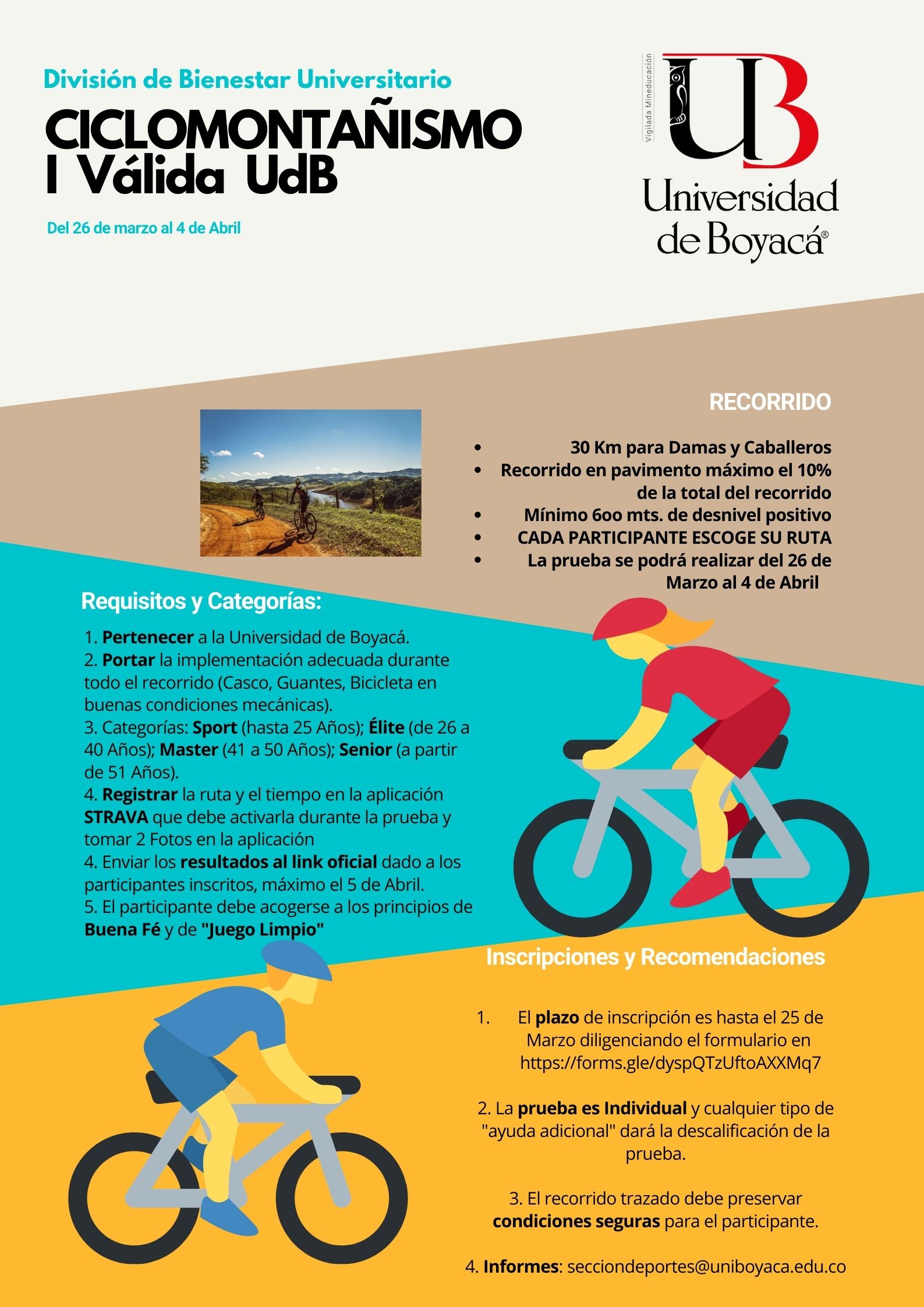 La I Válida de Ciclomontañismo "UdB" es una prueba de 30 Km, donde podrán participar todos los aficionados al MTB de la Universidad de Boyacá; se llevará a cabo del 26 de Marzo al 4 de Abril.