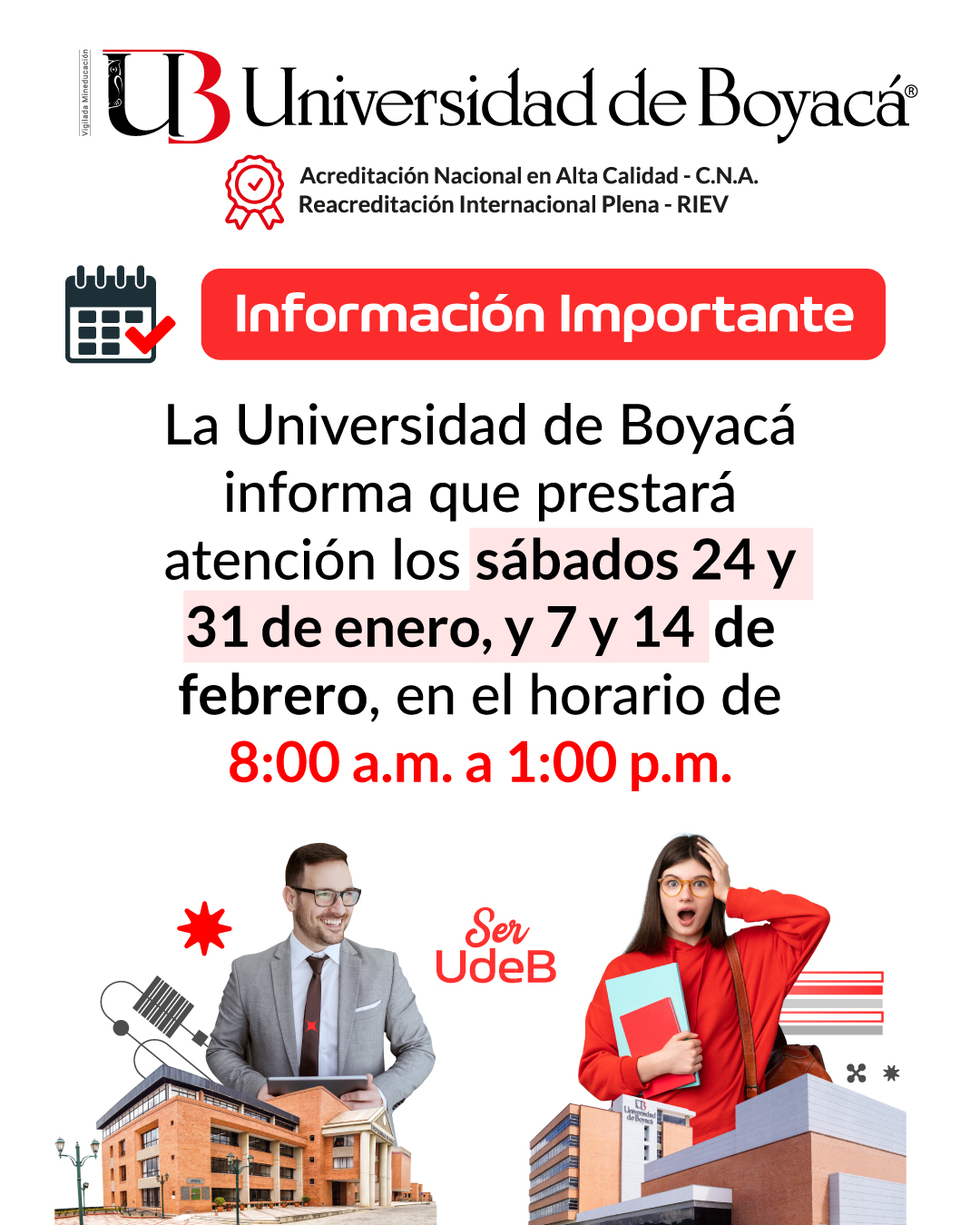 La Universidad de Boyacá informa que prestará atención los sábados 24 y 31 de enero, y 7 y 14 de febrero, en el horario de 8:00 a.m. a 1:00 p.m.